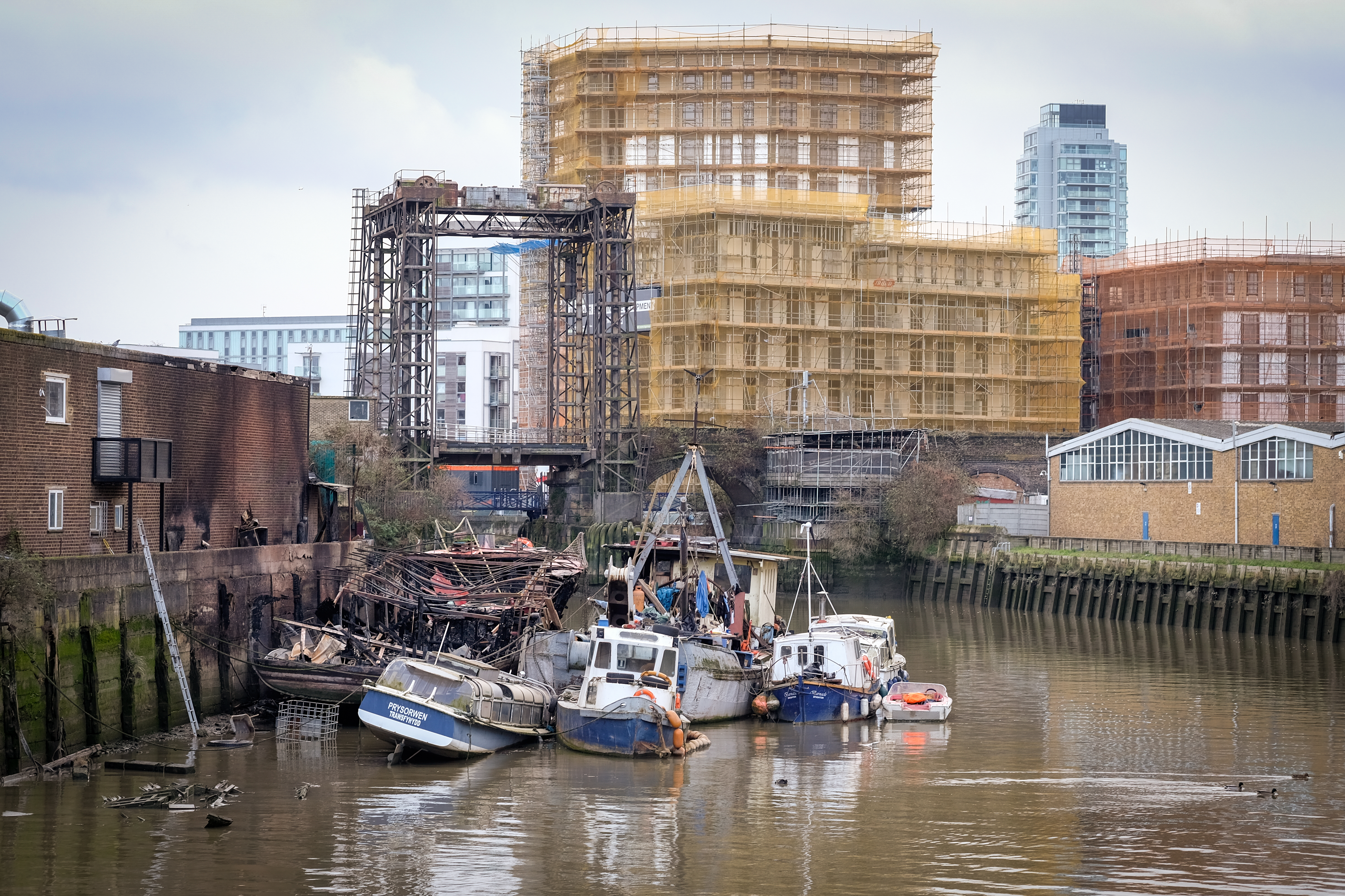 A quick look at Deptford Creek from behind the Trinity Laban dance centre on a cold Saturday afternoon. The second shot shows the charred remains of a ‘Ham’ class minesweeper boat built in 1954 and more recently used as an arts venue, gutted by fire in the first week of January. A sorry sight.