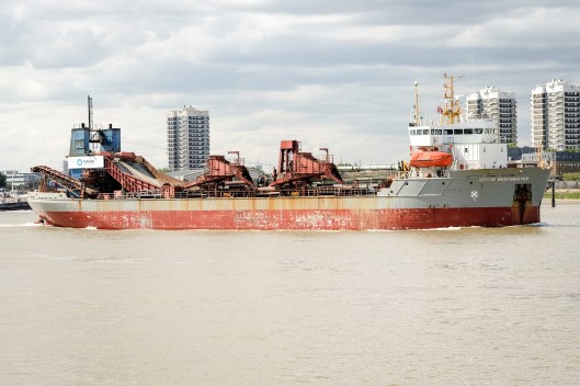 One of a small number of protected wharves, the Deep Water Terminal is used for – as far as I can tell – loading and/or unloading of aggregates; it’s an entirely different world from the O2 arena around the corner, Canary Wharf over the river, and the new flats that are (slowly) appearing around the rest of the of the peninsula. Long may it run.